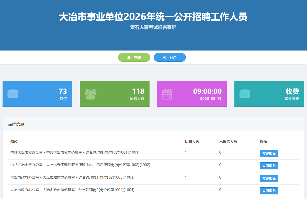 2026年黄石大冶市事业单位统一公开招聘118人,报名时间为2026年3月19日9:00至3月25日17:00。本次公开招聘考试的报名、查询、缴费和打印准考证均通过黄石市人力资源和社会保障局官网“人事考试专栏”(http://rsj.huangshi.gov.cn/rsksy/)进行。事业单位ABC类岗位笔试时间:2026年4月11日(星期六)上午,事业单位D类笔试时间:2026年4月12日(星期日)上午,笔试时间地点笔试准考证。